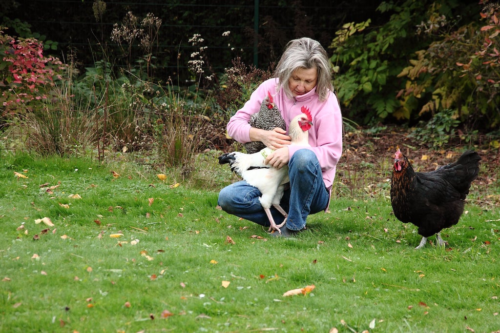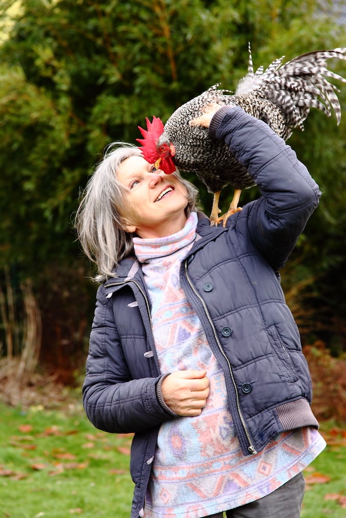Die Tiere halten inne, lassen sich willig dirigieren, und unser Fotograf drückt auf den Auslöser. Das Bild zeigt eine Frau mit Hühnern, die sich darauf spezialisiert hat, Hühner zu fotografieren.